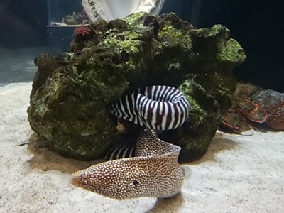 | 点々と縞々、模様の違うウツボが呉越同舟。姿かたちは違っても、僕らはみんな兄弟だってか。 | ![]() |