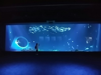 | 大水槽は、こうやって上からガラス越しに観察することもできる。海中散歩の感覚か。 ただ、これって美ら海の真似っこですよね。これを含めて、この水族館には、飼育動物の品ぞろえといい、見せ方といい、他の施設のパクリが多い。パクるならパクるでオリジナルの倍ぐらいすごいものを作ってくれれば納得なんだけど、規模感も小粒だ。長期的な集客は厳しいかもな。短期的にも新型コロナでインバウンド客を呼びこめず、多難の船出かと。 |