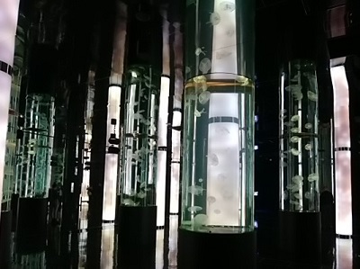 クラゲのコーナー。柱状の水槽が立ち並び、一見すると迷宮のようだ。でもよく見ると、鏡の効果で水槽が実際よりも多く見えていることに気づく。時間の経過とともに照明の色合いが変わるのも幻想的。 |