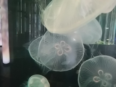 | バックヤードツアーに参加したら、クラゲのことをいろいろ教えてもらえた。その受け売りで、なぞなぞを1つ。次の3つのうち、クラゲにもあるものはどれ?(1)心臓(2)目(3)脳。 中央部の花びらみたいな形の部分がほんのり赤く染まっているのは、そういう色のエサを食べたせいらしい。 |