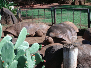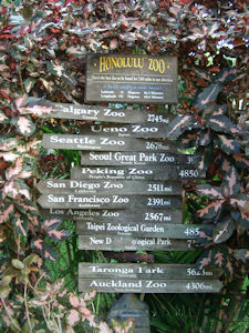 | さして規模は大きくないが、「半径2300マイル(約3700キロ)で最高の動物園」を自称。そりゃそうだ。ハワイ諸島は絶海の孤島群なんだから。 各方向指示版には「上野動物園まで**マイル」「サンディエゴ動物園まで**マイル」という具合に、環太平洋の主だった動物園までの距離が表示されている。 |