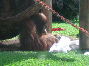 | グータラしていたオランウータン。彼らにはカラッとしたハワイの空気より、ジメッとしたボルネオの空気の方が合うのかも。 | |