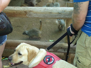 | ミーアキャットたちは盲導犬が近づいても逃げ隠れせず、逆に群がってきていた。顔見知りなのか? | |