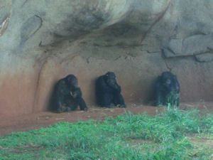 | 4日間のハワイ滞在中、この日だけはほぼ1日中、雨がやまず、チンパン君たちは迷惑顔。このあたり、ヒトとの近さを感じますね。 この3頭も、雨のやみ間にはてんでに遊んでいたのだが、降り始めると雨を避けられる場所に寄りあつまり、「見ざる言わざる聞かざる」みたいな絵づらになった。 |