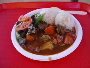 | 園内で食べたビーフシチュー・プレート、8.90ドル。お味は、まあその、語るに値せず。 それより、パンではなくライスが付いてくるのに目を引かれた。やっぱり米国本土とは違いますね。 |
