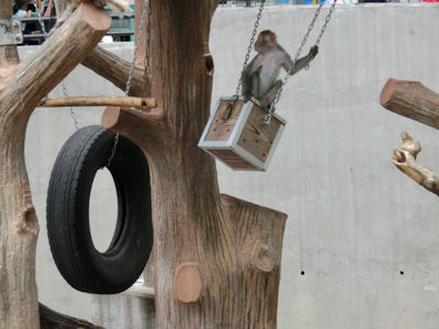 | ここの猿山にいるのはニホンザルではなく、アカゲザル。 写真の箱形ブランコはけっこう人気があるようで、何頭かが入れ替わり立ち替わり乗って遊んでいた。左側には本当のブランコやタイヤも吊られているのだが、そちらは人気薄の様子。 |