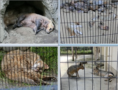入園したのが昼下がりとあって、夜行性の動物たちは軒並み情事ならぬお昼寝の最中だった。 (左上)アナグマ。警戒心皆無で爆睡し、時々四肢をピクリとさせるのがオカシイ。 (右上)フェネック。右手奥にいる奴はヘッドスライディングのポーズ。 (左下)アムールヤマネコ。金網ぎりぎりの場所で寝ているのは、せめてものサービス精神か。 (右下)マーラ。カンガルーと似ているけど齧歯類ですね。 以上の連中はとりあえず顔が見えたので写真を撮ったが、キツネやタヌキは客に背を向けたまま。あたかも妻に背を向けて寝てしまう倦怠期のお父さんのようであった。 |