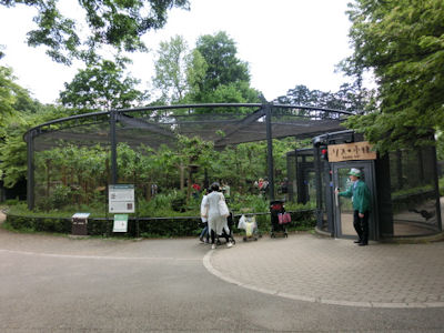 この「リスの小径」かも。 金網で囲まれた空間内には何十匹もの(もっと多いか?)リスたちが自由に動きまわっている。客は檻もガラスも隔てずに彼らを観察できる仕組みだ。 |