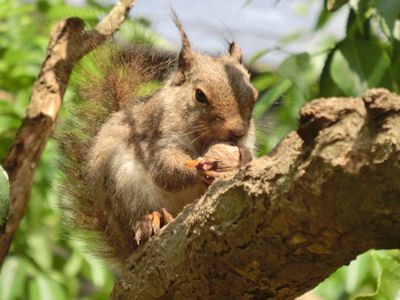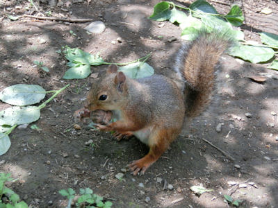 小径を歩くと、カリカリとシャリシャリの混じった不思議な音があちらこちらから聞こえてくる。ふと振り仰げば、巣箱や枝の上でクルミを噛み割ろうとしている愛らしいリスが。 ・・・というか、姿は愛らしいけど、写真のとおり目は全然笑っていませんね。 そういえば、とがった耳の毛もちょっぴり悪魔的? |