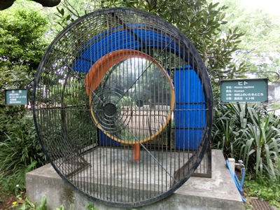 | 客が檻の正面に立つと、鏡に映った我が身が檻の中にいるように見える。これぞヒトの展示でござい・・・という趣向がこの園にも。 ただ、檻の大きさと鏡の大きさが合っていないので、いまひとつ視覚的な効果が薄い・・・。 |