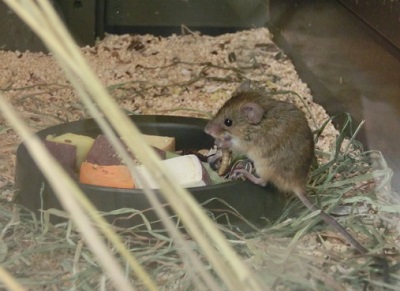 「資料館」の一角にすむ、体長数センチのちっちゃなカヤネズミ。この子は飽食していないらしく、何かを一心に食べていた。その姿のカワイイこと。 まあ、自宅の台所にいられたらイヤだけどね。 |