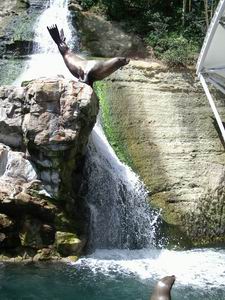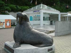 | こちらはダイナミックなトドのダイビング。高さ7メートルの岩場で倒立したかと思いきや、次の瞬間にはザブーン!だ。 演じるはオスのゲンタ君、603s。メスのコハルおばさんも、この半分ぐらいの高さのところから飛び込む。 「シーズー」と呼ばれるこのエリアでは、他にも体重1300sのセイウチや、水深12メートルの大水槽(フロア3階分だ)を見ることができる。 |