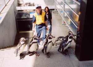 | お散歩するフンボルトペンギン。午前と午後の2回ずつ、飼育舎の周囲を歩かせている。てんでに違うところに行ってしまうなんてことはなく、ちゃんとひとかたまりになって歩くので、監督はお姉さん1人でも大丈夫だ。 別に強制しているわけではなく、出てくる奴だけを歩かせ、出てこない奴は飼育舎に残すのだとか。この回は7羽が華麗(?)なパフォーマンスを見せてくれた。 階段をヨチヨチ上り下りする姿がキュート。 |