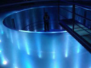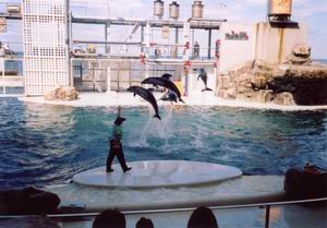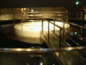 | ・・・全周スクリーンには水中に潜行するかのような映像が映し出され、ステージが実際、3メートル近く沈下するのである(手すりの位置を上の写真と比較されたい)。 ドーナツ状プールの水位は変わらないから、まさに海に潜った気分。カマイルカが自分たちの周囲を猛スピードで泳ぐ様子は幻想的だ。嵐に見舞われた演出があれば、まわり中から滝のように水が注ぐ。タコに襲われればステージ自体が揺れる。高い交通費をかけていっても、そこそこ損はないアトラクションではあった。 |