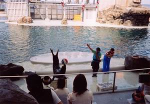 | イルカに続き、アシカのショー。進行役のお兄さんに指名された観客は、アシカと握手することもできる。 最後にカリフォルニアアシカとオタリアの絡みもあるのだが、実際には両者を絶対10メートル以内に近づけないよう配慮していたのが見え見え。ニアミスするとケンカしちゃうのかな? |