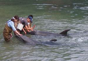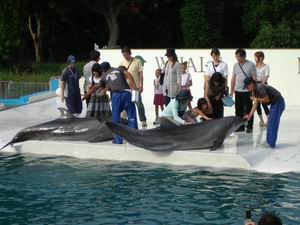 | イルカショーの最後にも、お触りタイムが待っている。こちらは希望者全員が無料で触れる。 | |
