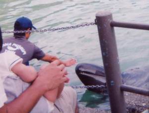 天然の入り江を利用した生け簀には、たくさんのイルカや、小型の(といっても体長数メートルの)クジラが飼育されている。好奇心の強いやつは、こんな具合に寄ってきて愛嬌を振りまく。 一部のイルカは水中トンネルを備えた大水槽で飼われているのだが、この方が距離感が近くていい感じだ。 |