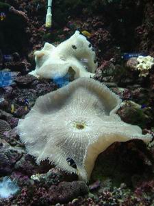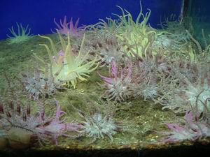 | 進化の道筋をたどりながら串本の海の生き物たちを紹介するのが、水族館のAゾーン。この水族館は、とりわけ原始的な生物の見せ方がうまい。 前の写真はとりあえずイソギンチャクの仲間だとわかるが、こちらはいったい何なのか? もちろん分類名が知りたければ表示板を見ればいいわけだが、巧みな照明に浮かびあがるその怪しい美しさを堪能するだけでも十分ではないか。 |