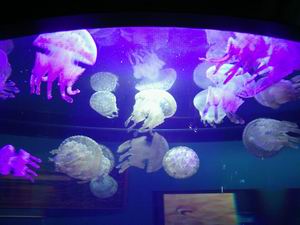 | このところ静かなブームを起こしているクラゲ。鶴岡市立加茂水族館や、新江ノ島水族館など、クラゲを売りにする水族館も増えている。テレビドラマでは竹野内豊がクラゲの飼育員に扮しているし。 この水槽もまたライティングが幻想的。半透明なクラゲの体に、光がビミョーに反射したり吸収されたりする様子が美しい。 |