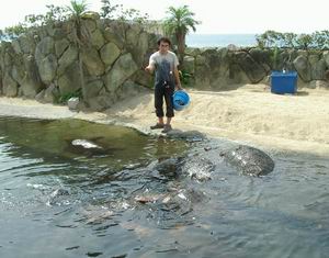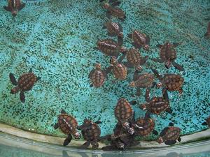 | Bゾーンではウミガメが飼育されている。中には体重100キロを超える大物も。 この水族館では毎年、アカウミガメに産卵させているそうだ。 |