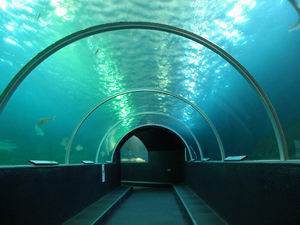 | Cゾーンにある長さ24メートルの水中トンネル。公式HPには「1250トンの水槽に大型のサメやエイ、クロマグロなど大型回遊魚がところせましと泳ぎ回ります」とあったが、ご覧の通り、それほど“ところせまし”とは泳いでいない。 |