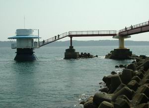 | 左手にあるのが海中展望塔。沖合140メートル、水深6.3メートルの海底が見られる。 NHKの特別番組『街道てくてく旅。熊野古道をゆく』のロケ隊も来ていた。金を払って入場している一般来訪者を歯牙にもかけず、大人数で狭いスペースを塞いでいた。 |