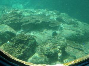 | 水面下の丸窓から外をのぞくと、そこはサンゴの海。とはいえ、普段はそこにいるはずの「熱帯・亜熱帯のカラフルな魚群」にはお目にかかれなかった。かろうじて1匹見つけて、写真に撮ったが、おわかりになるだろうか? 魚がいないとあって、この日は海中観光船も欠航。台湾付近を通過中の台風の影響だと言われて、ちょっと驚いた。 |