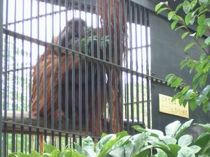 | その結果がこれだ。私が小学生の時分は、どこの動物園でもこの手の狭い「檻」に動物たちを押し込めていたもの。近年になってエンリッチメントやエマージョンという新しい動物園経営の概念が普及し、各地の動物園から金網が消えたり、強化ガラスが使われるようになったりしたが、ここ京都市動物園では、今もこうした「さびた鉄棒と金網」による展示が大半。何やら不思議な懐かしささえ覚える。福祉の観点からはどうかと思うが、狭い分、動物との距離が近いこと。 | |