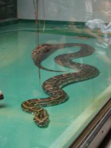 | ビルマニシキヘビのタマコ。こちらの掲示板はなかなかユーモラスだ。 「特技は目をあけたまま寝ることと,月に1回しかウンコしないこと!楽しみはね,週に1回ウサギを食べることなの。嫌なことはあんまりウンコしないと獣医さんにしぼりだされることかな。すっきりするけど痛いのよ,まったく!」(ママ) これを読んだ上でタマコさんご本人を見ると、おやおや、尻尾の方に何やらツチノコのような膨らみが。見物客たちは「丸呑みしたウサギだ」「いや、ひと月分の宿便だ」と、盛り上がることしきりだった。 乾燥させ、樹脂で覆った「ウンコ」の実物も展示されていました。 |