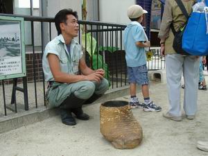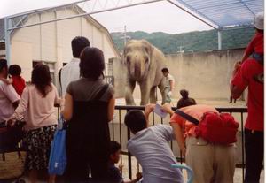 | 飼育員さんの前に置いてあるのはアジアゾウの足。本物だ。皮の厚さは4センチほどあっただろうか。人間と比べればデカいが、これ4本であの巨体を支えるのかと思うと、意外に小さいような気もしますね。剥製になって多少は縮んだのだろうけど。 この飼育員さんは、こうして客とコミュニケートしていたかと思うと、次の写真のようにゾウの囲いに入ってガイドを行い、しばらくすると向かいのペンギン舎で給餌ショーを見せる。バックヤードで煙草を吸っていることだってできるだろうに、頭が下がりますね。 |