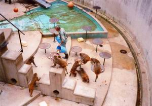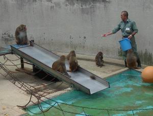 | この動物園の猿山はニホンザルではなくアカゲザルだ。 エサの時間になると、秘密の通路を通って飼育員さんが下におり、軽く説明など加えつつ(サルにではなく、客にだ)、野菜や果物を与える(客にではなく、サルにだ)。 |