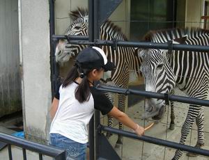 | 時間帯によっては、こうしてシマウマにエサを与えさせてもらえる。が、草食動物だとわかっていても、最初はおっかなびっくりだったりする。飼い犬ならぬ、飼いシマウマに手をかまれるなんて目には遭いたくありませんからね。 この少女の弟はどうにも腰が引けてシマウマに近づけず、父親から「へたれ」呼ばわりされていた。「へたれ」とは「屁垂れ」のことだろうか。関西人の悪口は辛辣だ。 これがシマウマ、いや、トラウマとなって、あの少年は今後死ぬまでシマウマに乗ることができなくなってしまうだろう。・・・別に困らんか。 |