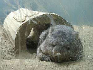 | タスマニア館にいたウォンバット。有袋類である。夜行性のため、昼間は寝てばかり。この写真を撮ったときだけは、うまい具合に外に出ていたが、あとはずっと土管(?)の中に潜り込んでいた。顔がでっかいこと。 檻の外には、この動物のぬいぐるみが置いてある。「持ち上げてみてください」との説明付き。なんとこのウォンバット、見かけによらず体重が30キロもあるという。ぬいぐるみもその同じ重さになっているのである。お父さん、うかつに抱き上げると、ぎっくり腰になりますよ。 |
