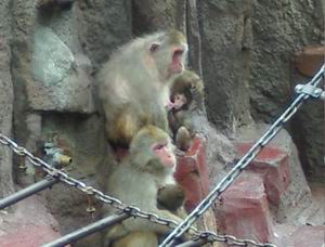 | この赤ちゃんは、この日の朝生まれたばかりだと、飼育係氏が教えてくれた。「そんな新生児を展示に出して大丈夫なんですか?」と、ビックリして聞くと、彼は事も無げに答えた。「ええ、そのまんまですから」 母親は19歳とかなりの高齢で、もう子供は生まないと思われていたらしい(これも飼育係さんの受け売り)。妊娠したメスザルは冬毛を落とさないのだそうで、確かにお母さんは、周囲のサルたちと毛色が違っていた。 |