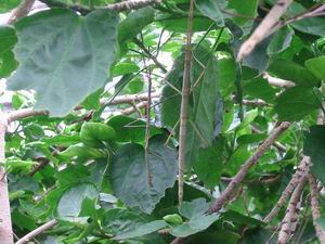 | おわかりになるだろうか? 木の枝に擬態したオキナワナナフシである。うまく化けるものです。 | |