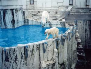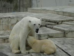 | 危ないってばさ! ギャラリーの目を意識して、ちょっとよろけて見せたりするあたり、小さいながらも、なかなかのショーマンである。 子供が口に魚をくわえているのがご確認いただけるだろうか。これがホッキョクグマのエサやりタイム。プールの中には生きた魚が放してある。子供の方がお母さんより魚取りがうまかったように見えたが、気のせいだろうか? 自分で狩りができるのに、まだママのオッパイをもらっているわけですね。 |
