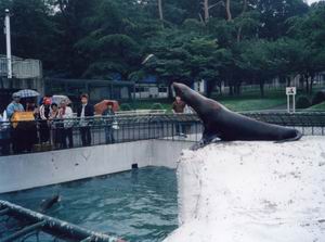 | こちらは海獣舎のエサやりタイム。トドは岩の上に陣取り、左手に見える飼育係さんや、来園した子供たちの投げる魚を器用に口で受け止める。 もちろん子供たちの多くはあさっての方に投げてしまうが、プールの中にいる奴がちゃんと拾って食べている。 トドの鼻先で魚が宙を舞っているのがおわかりだろうか? 後で飼育係さんにうかがったら、種類はホッケだとのことだった。 |
