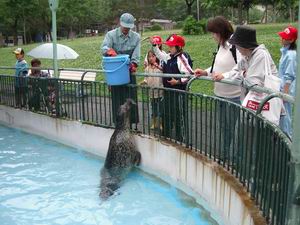 | 続いてゴマフアザラシのエサやり。手渡しで魚を与えているのだが、指をかまれたりしないのだろうか。 ちなみに飼育係氏の右側にいる黄色い長靴の女の子は、ちっちゃいのに、トドへのホッケ投げが異様にうまかった。将来は水原勇気か、はたまたプロのホッケ投げ師か(そんな商売はない)。 |