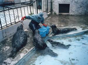 | ゴマちゃんには来園者参加のエサやりが行われたが、このゼニガタアザラシには、飼育係氏が1人で檻の内側に入り、エサを与えていた。 なぜだろう? 同じアザラシでも、素人のエサやりには適さない習性を持つのだろうか? |