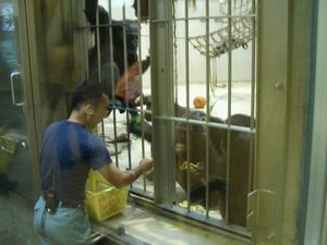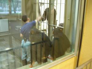 | チンパンジーの屋内展示場でもエサやりが行われていた。ニホンザルと同様、メニューには煮干しが。 見ていると先に果物を与え、後からニンジンやジャガイモを与えている。人間の感覚だと、先においしいフルーツを食べてしまったら、野菜など食べたくなくなってしまいそうだが、彼らはそんなわがままを言わないようだ。 最初は鉄格子越しにエサをもらっていたチンパン君たちだったが・・・。 |
