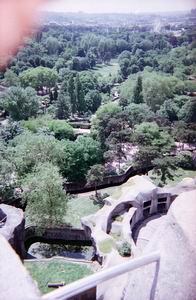 | で、フランス語至上主義者のエレベーター係を突破して岩山に上ると、こんな風景が見える。森と湖、5月の陽光、おフランス。絶景である。 地上に下りた後、「すっごくいい眺めだね。感動しちゃった!」と、エレベーター係に熱っぽく語る少女がいたが(フランス語だったので、話の内容はあくまでも想像です)、それも十分にうなずける。 高所恐怖を抑えて下を見下ろせば、アリのように小さなライオンやトラの姿が。それもまた一興だ。 |