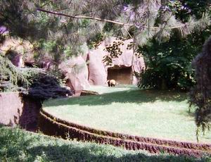 | 写真の中央付近に小さく見えているのが、ご存知、ジャイアントパンダ。中国のパンダ外交の成果がここにも。 本来、パンダは森で暮らす動物なのだが、ずいぶんと広い運動場を与えられたものだ。 |