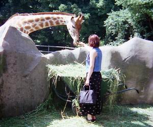 | こんなふうにキリンにエサをあげられる状態になっていたが、ここは普通の観覧ポイントではなく、横手の作業スペースのような場所。別に立入禁止にもなっていなかったので、このご婦人の後について入ってしまったが、勝手にエサやりまでしてよかったのだろうか? | |