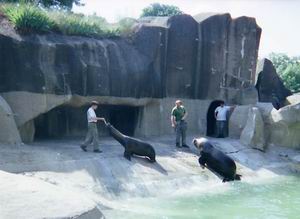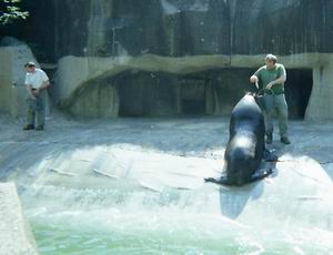 | OTARIEというからアシカだろうか。海獣類の名前は英語でもきちんとした区別がなされていなくて、ドキュメンタリー翻訳をするときなど、苦労するケースが多い。 これはエサやりタイムの写真。何かお魚をもらっている。体の大きさからすると、相当食べるんだろうなあ。 |