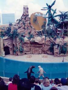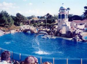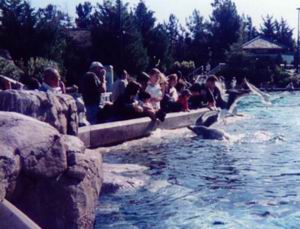 | サンディエゴ近郊には動物関係のテーマパークが密集している。ここ、シーワールドもその1つ。ダウンタウンから8キロほどの位置にあり、路線バスで行ける。 写真のプールは、イルカの体に直に触れられるというスポット。といっても黙って待っていたのでは寄ってきてくれないため、彼らをおびき寄せるための小魚が売られている。 ところがカモメなどの海鳥(野生)も、それを狙っているんですね。せっかくのエサをかすめ取られて怒っている人も。 |