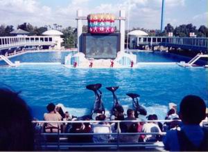 | シーワールドで人気ナンバーワンのショーといえば、この「シャムー・ショー」。なんとシャチが芸をするのである。 ウェットスーツを着た男女が、体長9メートルの“海の殺し屋”と同じプールに入って演技をするのだが、あんたら、怖くないのか!? |