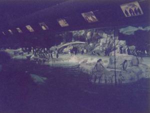 | シーワールドはショーばかりを見せているわけではない。サメ、ラッコ、ウミガメなどのいるプールや、各種の魚類を集めた複数の水族館が設置されている。 ここは「ペンギン・エンカウンター」。南極を模した広大なガラスケースの中に、300羽以上のペンギンが飼われている。一口にペンギンといっても、種によって様々な外見をしていることがわかる。 |