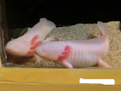 | 入り口の横で真っ先に迎えてくれるのが、昔懐かし、ウーパールーパーたち。うわ、まだ引退してなかったんですか、って、落ち目の芸能人じゃないか。 なお、カメラの設定を気にせずに撮っていたら、右下に無関係の日付が写しこまれてしまったので、各写真の画像を修正しております。 |