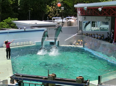 なぜ今回、「しな水」を再訪する気になったかというと、その数日前に、「5年後を目途にイルカショーを終了する」というニュースが報じられたから。ほかの水族館の開業や、施設の老朽化、そして追い込み漁で捕獲したイルカを入手できなくなったことなどが相まって、イルカのショーと展示を終了することにしたそうです。「展示」をやめるということは、普通に考えたら「飼育」もやめるということなので、これは今のうちに見ておかないと、と。 国際社会の趨勢とはいえ、客席を埋めた黄色い帽子の園児たちも、こんなに喜んでいるのにねえ。 |