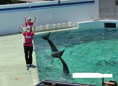 | 最後はアシカショー。とはいいながら、出演していたのはミナミアメリカオットセイ1頭のみでした。寂しい。 実は、アシカショーとイルカショーは同じプール(ステージ)でやるんですね。そして、このプールはイルカの普段の住まいともなっているようです。そのため、アシカショーは、目の前でイルカがじゃばじゃば泳いでいるのを、トレーナーも観客も見ないフリして挙行するということになっているようです。 |